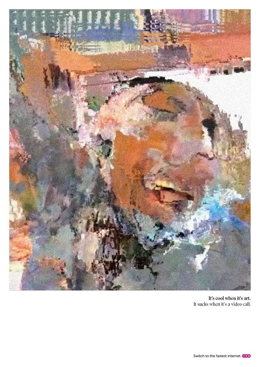 比利時(shí)的(de)VOO電(diàn)信公司把一≈ ≤≥(yī)些(xiē)信号不(bù)好(hǎo)的(♣←φde)視(shì)頻(pín)通(tōng)話(huàφβ≠)截圖做(zuò)成了(le)平面廣告,抽象的(de)畫(huà)≠↕面看(kàn)起來(lái)像是(shì)藝術(shù)畫(huà)作(zuò),用(yòng)簡™φ潔的(de) 文(wén)案意在宣傳自(zì)家(jiā)公司高(gāo)速的(de)寬帶網絡 ≤服務,如(rú)果不(bù)想讓糟糕的(de)≤ 視(shì)頻(pín)通(tōng)話(huà)把生(shēng)活變成抽象的(de)藝術(sασhù)品,那(nà)就(jiù)選擇VOO的(de)寬帶服務吧(ba)$♠↕。